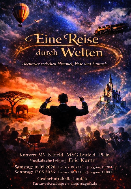 Das Projektorchester-ELP lädt unter der musikalischen Leitung von Eric Kurtz zu seinem diesjährigen Konzert ein. Unter dem Motto „Eine Reise durch Welten – Abenteuer zwischen Himmel, Erde und Fantasie“ werden die Zuhörerinnen und Zuhörer auf eine besondere musikalische Entdeckungstour mitgenommen. Die ausgewählten Stücke erzählen von großen Reisen, fantastischen Orten und spannenden Abenteuern. Von einer rasanten Weltumrundung über magische Welten bis hin zu einer Zugfahrt durch die Milchstraße erwartet das Publikum ein abwechslungsreiches Konzert voller musikalischer Eindrücke und Fantasie. Bildprojektionen setzen die Stücke visuell in Szene und sorgen für eine ganz besondere Atmosphäre.