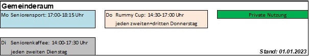 Die nagelneue Bestuhlung wertet den Mehrzweckraum deutlich auf und verleiht einen wohnlichen Charakter. Er grenzt an den Mehrzweckbereich der Unkenstein-Halle und kann für Tagungen und Sitzungen aber auch für gesellige Veranstaltungen und private Feiern angemietet werden; zusätzlich besteht die Möglichkeit der Mitbenutzung der Küche in der Unkensteinhalle. Im Gemeinderaum finden bis zu 90 Personen Platz; in Tischreihen bis zu 60 Personen.